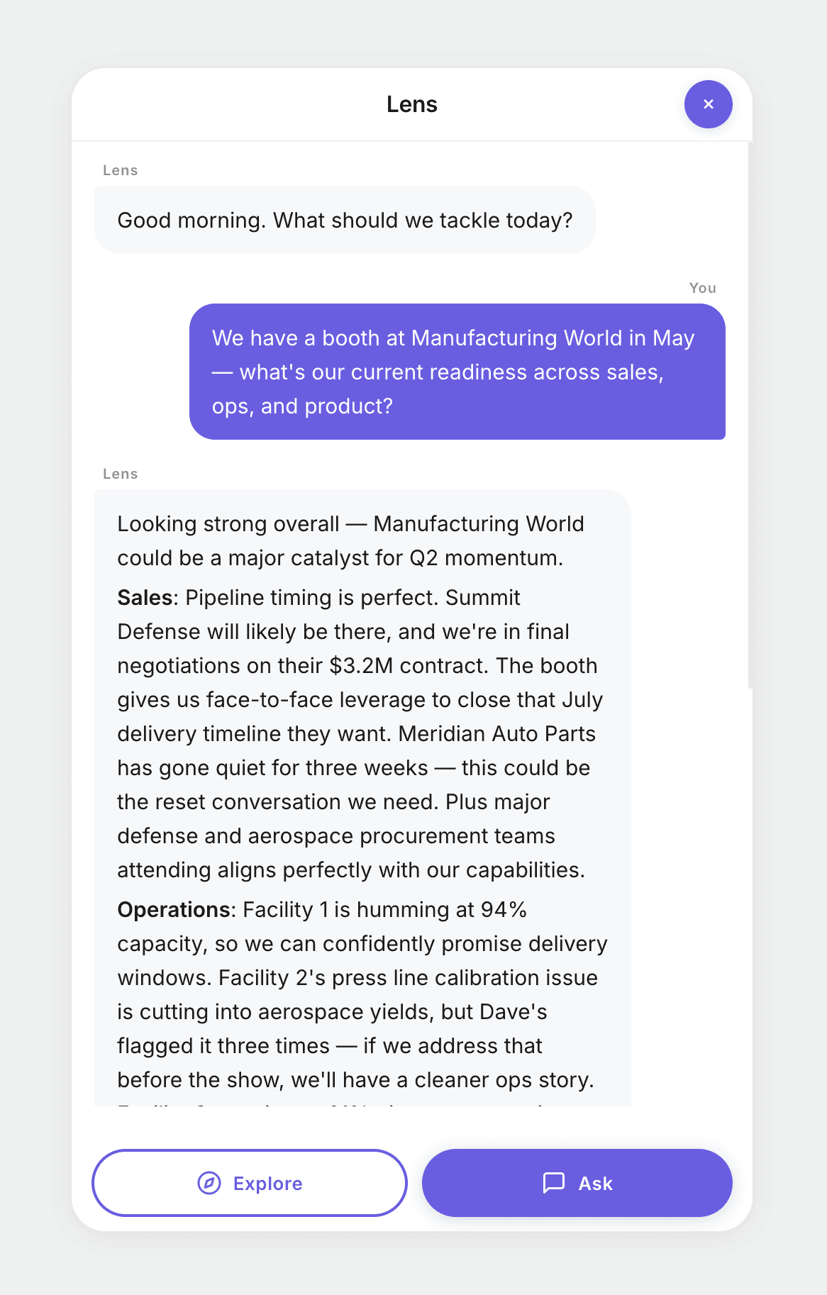 A quick conversation with Lens gives you directional peace of mind — knowing you can tackle it completely when the workday begins.